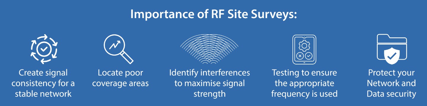 RF Site Survey is an essential procedure for developing an effective wireless network infrastructure and ensuring high quality radio coverage. The physical site, where wireless devices are to be installed, must be examined and measurements taken to establish the types, quantities and locations of wireless access points, antenna arrays, mounting options, cabling and power management details.